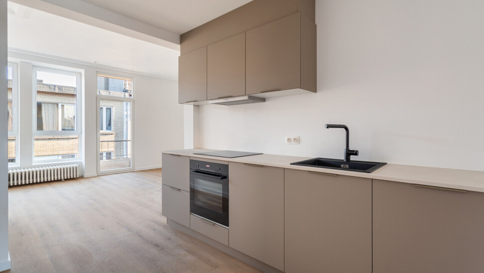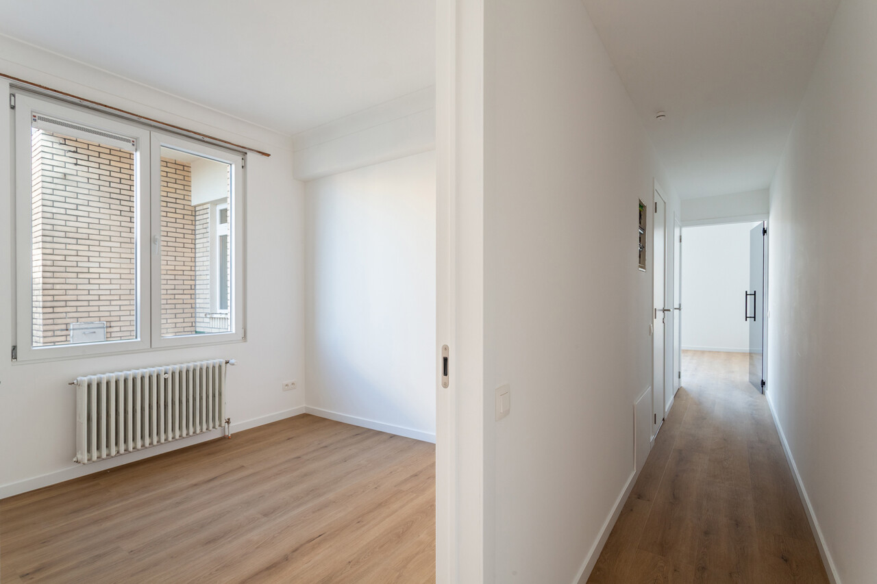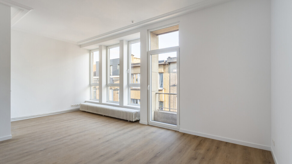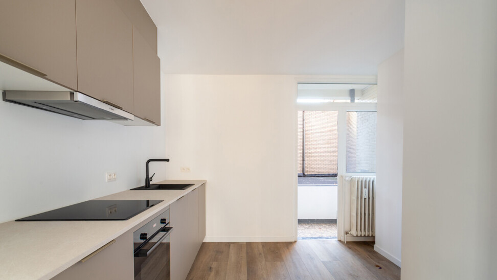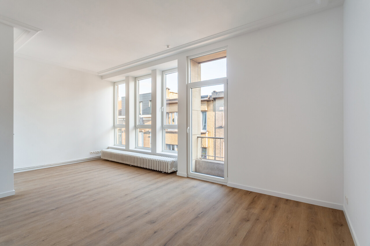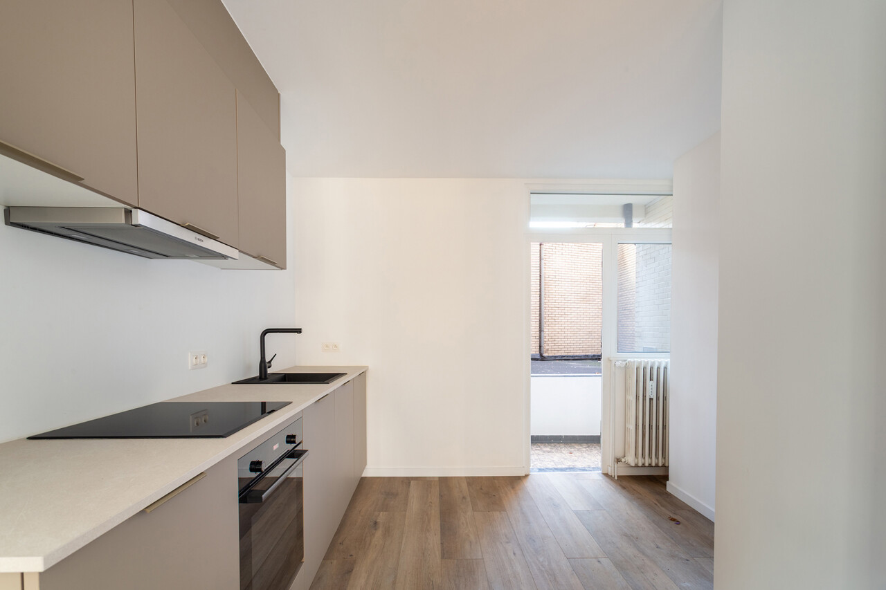 Volledig gerenoveerd appartement van ca. 79 m², gelegen in de Seefhoek en ingedeeld als volgt: inkomhal, woonruimte met brede raampartij en hoge plafonds en met open ingerichte keuken en terrasje van ca. 2,3 m². Verder nachthal met gastentoilet, douchekamer met cv en twee slaapkamers (16 en 9 m²). Ondergronds privatieve berging. Dit appartement maakt deel uit van een gebouw met zes appartementen (nog alle zes te koop, allen dezelfde prijs) en een handelsruimte op het gelijkvloers (eveneens te koop).. B-label. Asbestvrij. Beschikbaar bij akte. Vg, gdv, gvv, gvkr, wg.